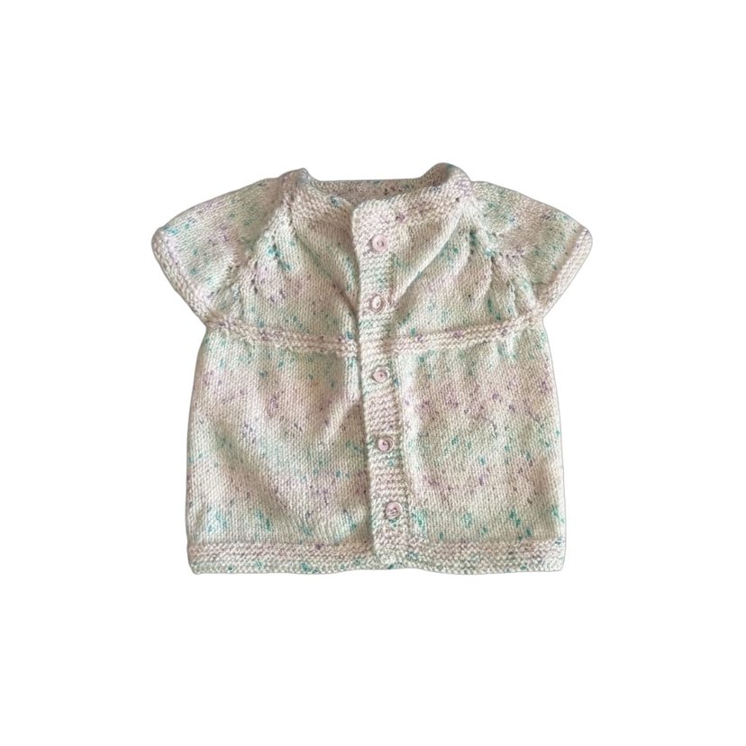 Beyaz, yumuşak örgü yelek. Yumuşak örgü kumaştan yapılmış, pastel tonlarda hafif desenli ve düğmeli.