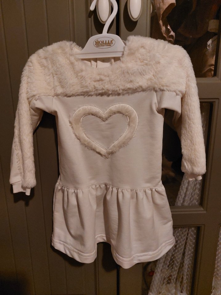 Beyaz renkli, uzun kollu, bisiklet yaka kız çocuk elbisesi, göğüs ve omuzlarda yumuşak kürk detaylarına sahip.