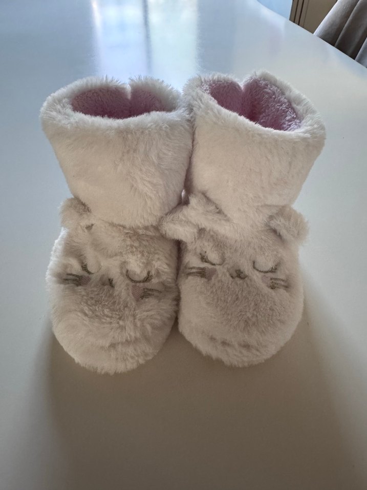 Kız çocuklar için beyaz, kürklü detaylı sıcak panduf. Düz ve rahat tasarıma sahiptir. Ayakları sıcak tutar.