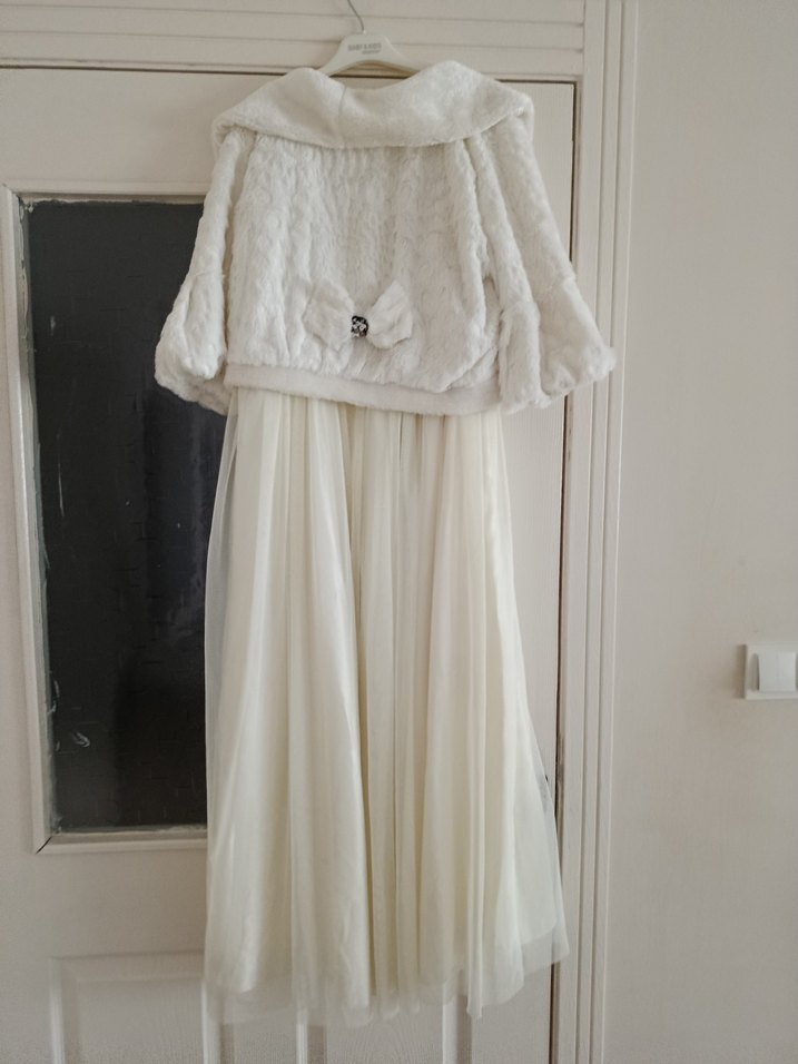 Beyaz renkte, uzun kollu ve straplez yaka tasarımlı kız çocuk elbisesi. Yumuşak ve sıcak kumaştan kürklü üst kısmı, bol kesim etekle tamamlanmıştır. Modern klasik tarzda, desensiz ve açık renklidir. ❄️