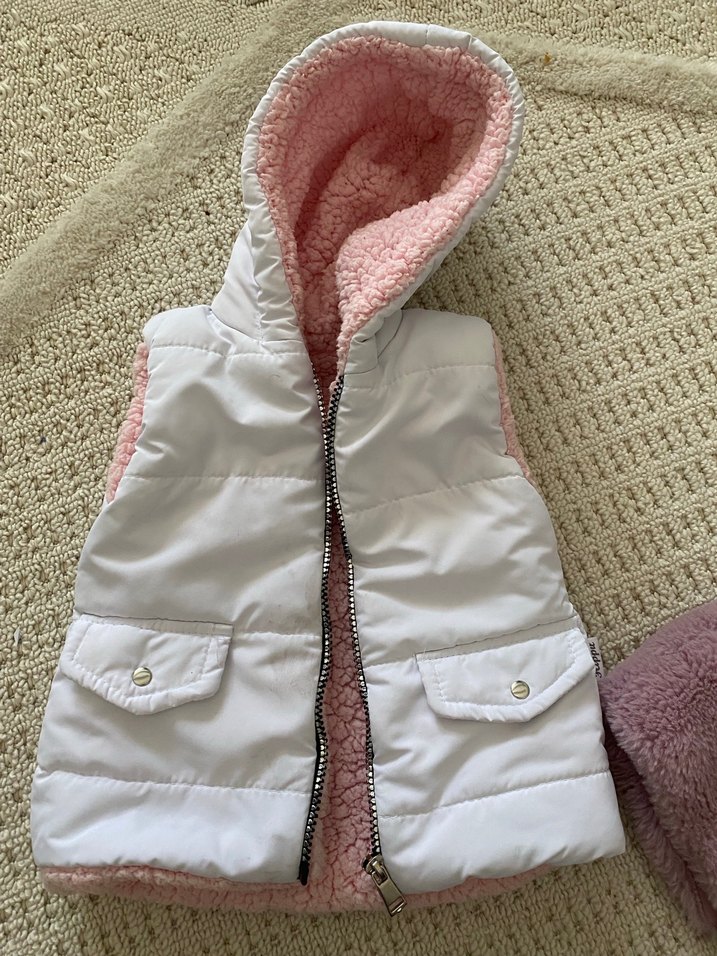 Kız çocukları için beyaz ve pembe pastel tonlarda, kürklü, kolsuz yelek. Fitted kesim ve çıtçıtlı cep detaylarına sahip.