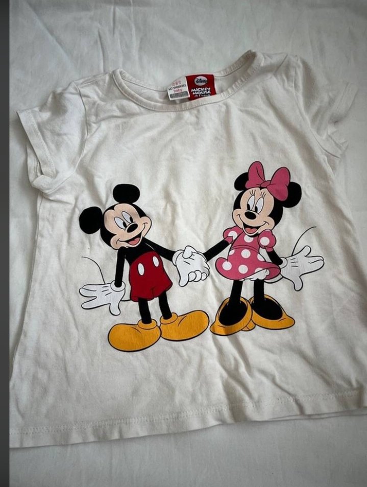 Pamuklu beyaz tişört, kısa kollu ve bisiklet yaka. Renkli Mickey ve Minnie baskısı ile trendy rahat stil için uygundur.