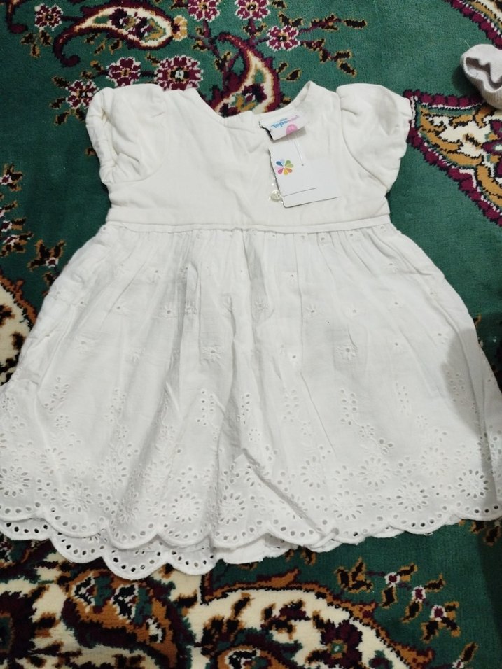 Beyaz pamuklu, kısa kollu, V yaka ve nakış detaylı bol kesim kız çocuk elbisesi. Bohem tarzda, yumuşak dokulu ve fırfır detaylıdır.