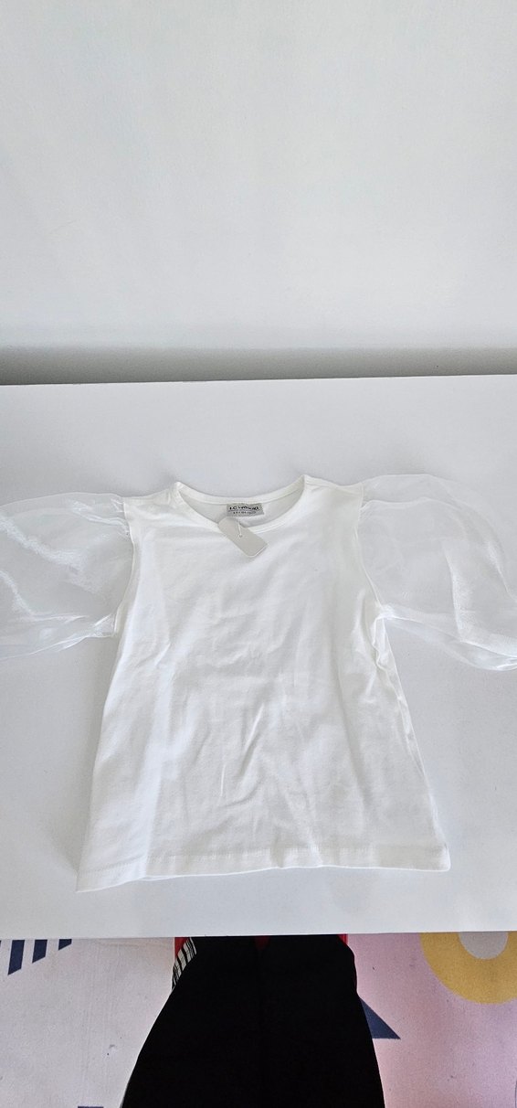 4-5 yaş..Beyaz, kız çocuklar için organze kabarık kollu tişört, rahat ve şık bir dokunuş sunar.