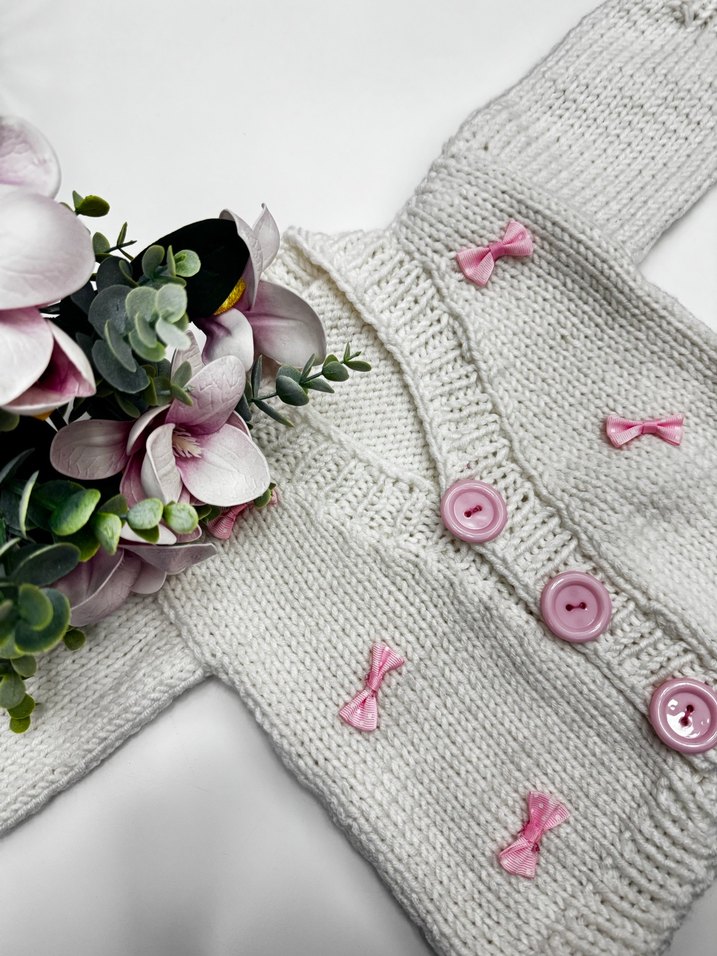 Uzun kollu, nakışlı pembe fiyonk detaylı, bohem tarzda beyaz kız çocuk triko hırka.
