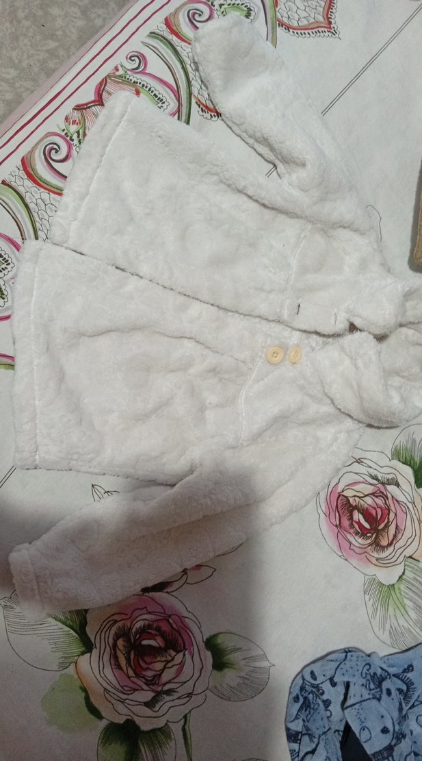 Yumuşak ve sıcak beyaz kız çocuk polar bornoz. Düğmeli ve desensiz sade tasarıma sahiptir.