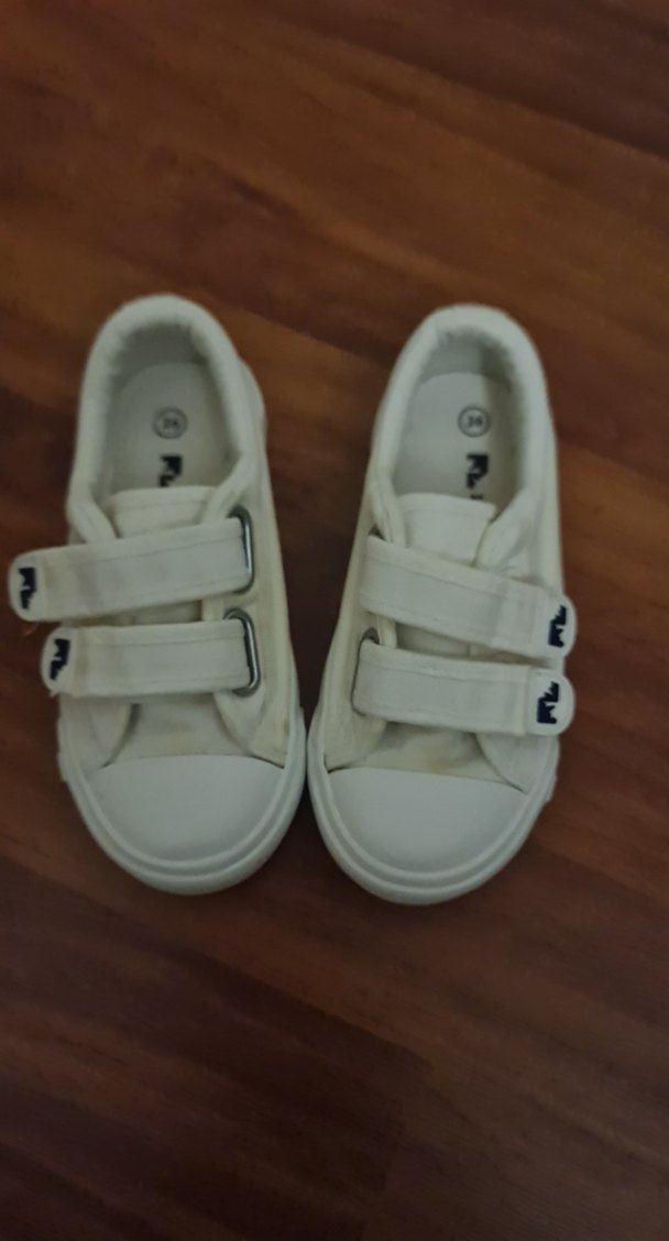 Beyaz renkli, Velcro bantlı, kauçuk malzemeden yapılmış, düz ve hafif renkli kiz çocuk spor ayakkabısı.