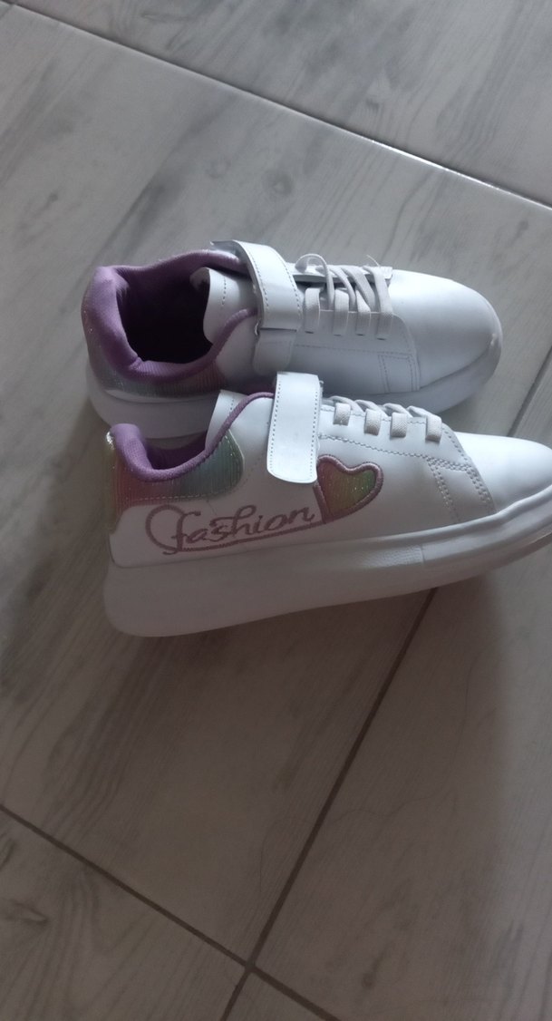 Beyaz kız çocuk spor ayakkabılar, pastel renkli baskılar ve velcro bantlıdır. Kauçuk tabana sahiptir. Yanında "Cashion" yazısı yer alır.