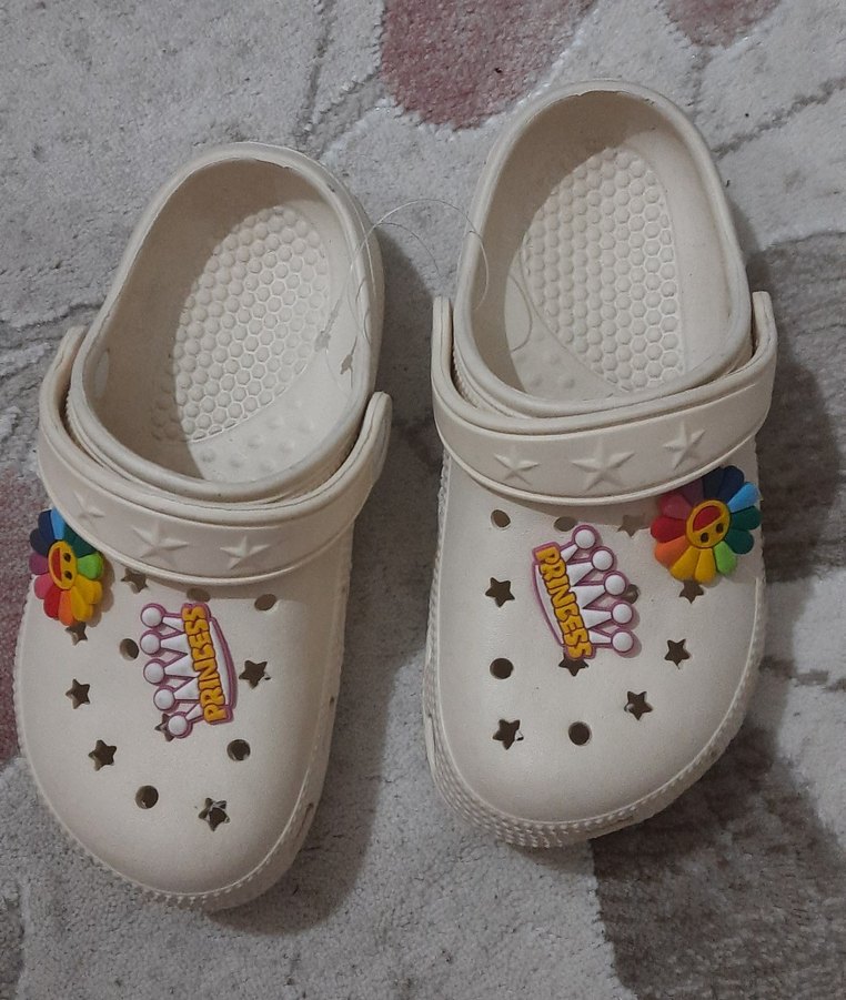 Beyaz kauçuk kız çocuk terliği, pastel baskılı süslemeler cross terlik Yıldız şeklinde delikler ve rahat dokulu taban içerir. 29 30 numaradir