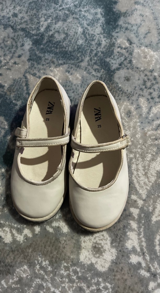 ZARA markalı, tokalı beyaz kız çocuk babet ayakkabı, sade ve desen içermeyen kauçuk malzemeden yapılmıştır.
