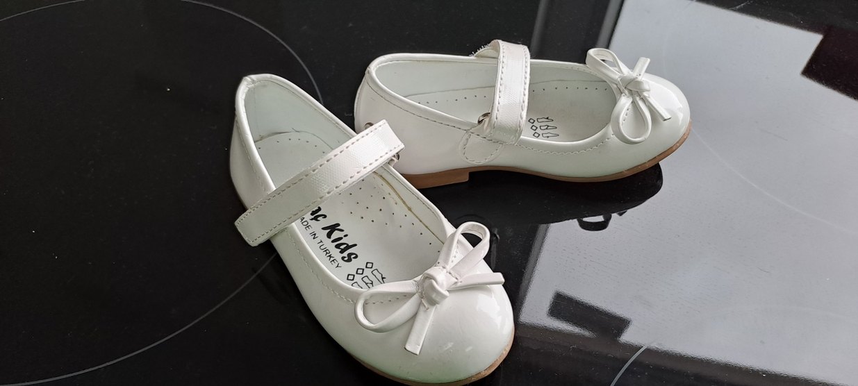 Beyaz kız çocuk babet ayakkabı, tokalı ve fiyonk detaylıdır. Lastik malzemeden yapılmış, modern klasik tarzda düz desenlidir.