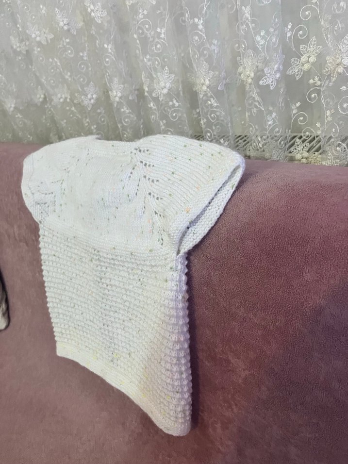 Yumuşak triko kumaştan, bohem tarzda, kolsuz ve vücuda oturan beyaz kız çocuk kazağı. Yeni örülüp hiç giydirilmedi