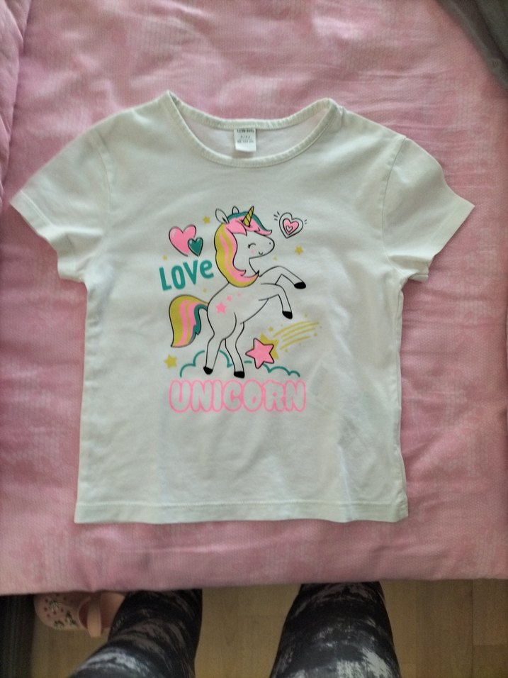 Beyaz, pamuklu, rahat kesim kız çocuk tişörtü. Pastel tonlarda unicorn baskısı ve 'LOVE' yazısı bulunur. Kısa kollu, yuvarlak yakalı, sokak stili.hicbir kusuru yok 1/2 kere giyildi..