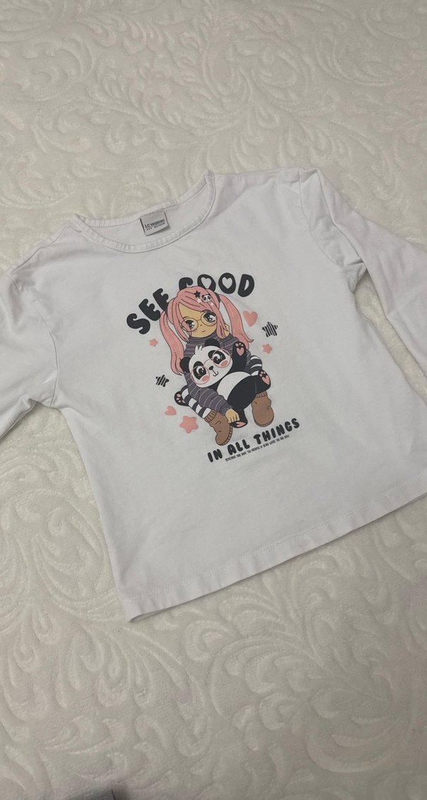 Pamuklu beyaz uzun kollu kız çocuk tişörtü, bol kesim ve yuvarlak yaka. Pastel sokak stili, baskılı 'SEE GOOD IN ALL THINGS' tasarımı ile. 1-2 defa giyildi temizdir