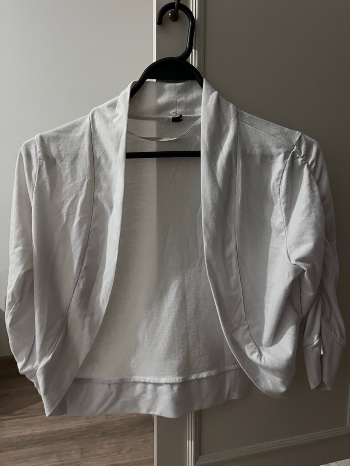 Beyaz renkli, uzun kollu, yakalı ve drapeli tasarıma sahip kız çocuk bolero. Keten kumaştan yapılmıştır, rahat ve şık bir görünüm sunar.