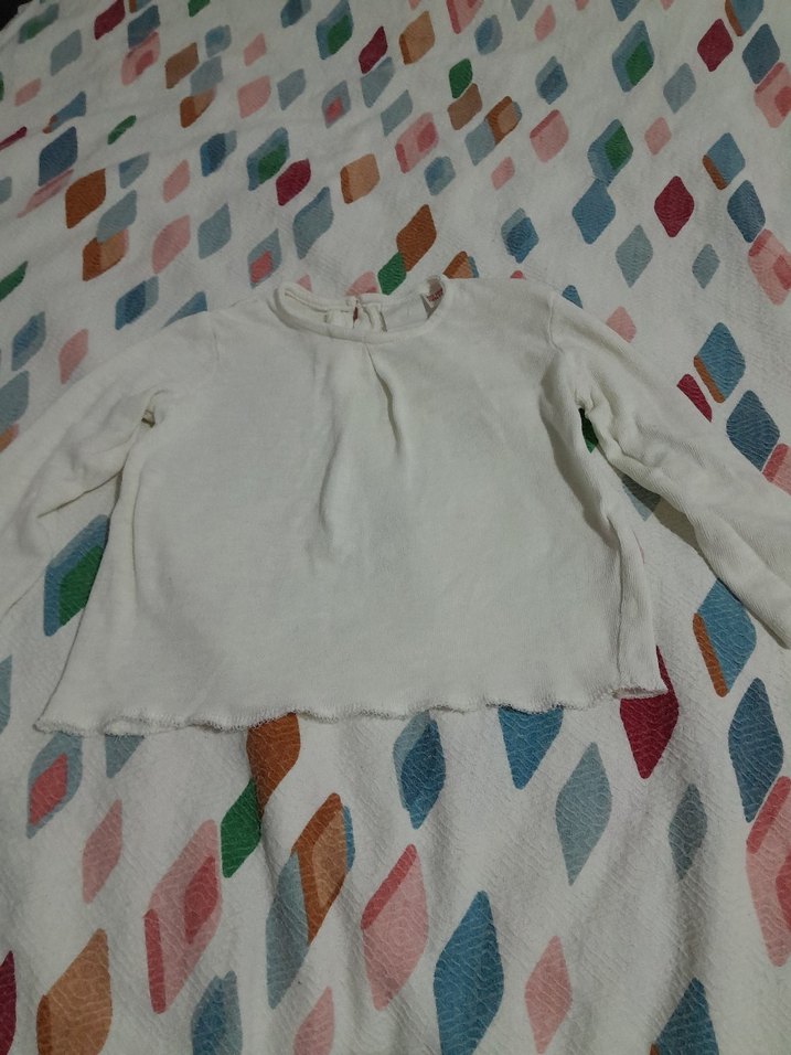 Beyaz pamuklu, uzun kollu, yuvarlak yakalı, fırfırlı ve bol kesim kız çocuk bluzu. Hafif ve sade tarzda.2 kez giydi.hırka ceket içi ve tek başına kullanılabilir