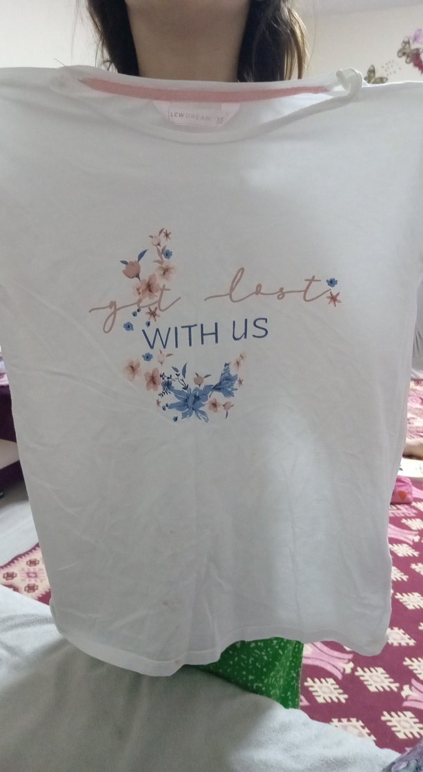 Beyaz pamuklu, bol kesim, V yaka kız çocuk tişörtü. Kısa kollu ve "WITH US" yazılı bohem tarzda baskıya sahip.