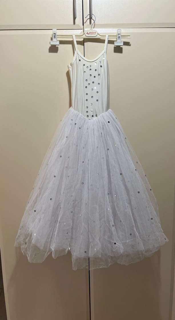 Beyaz, askılı üst kısmı olan, kat kat etekli, fit kesim kız çocuk elbisesi. Vals/Bale/ Gösteriye uygun