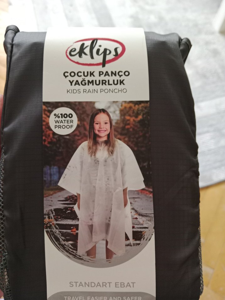 Beyaz renkli, kısa kollu ve bol kesim kız çocuk yağmurluk panço. Yuvarlak yakalı, cırt cırtlı kapanışlı, su geçirmez kumaştan yapılmıştır. ️
