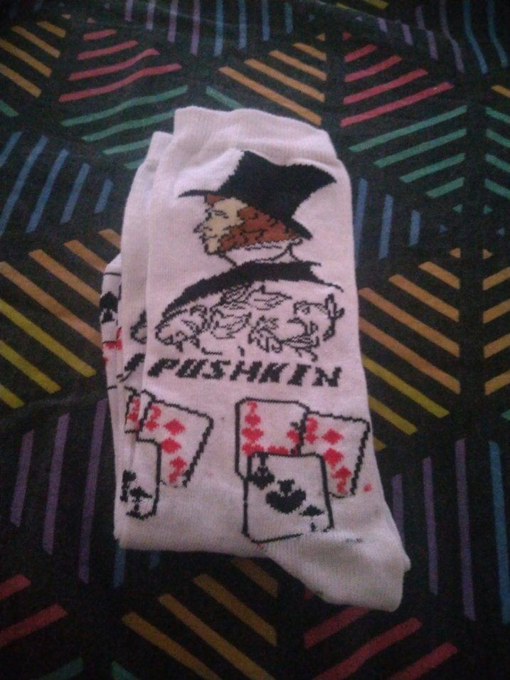 beyaz örme bayan çorabı, üzerinde portre ve iskambil kartları deseni bulunur. Canlı koyu renkler deseni ön plana çıkarır. yurtdışından alındı 2 adet var