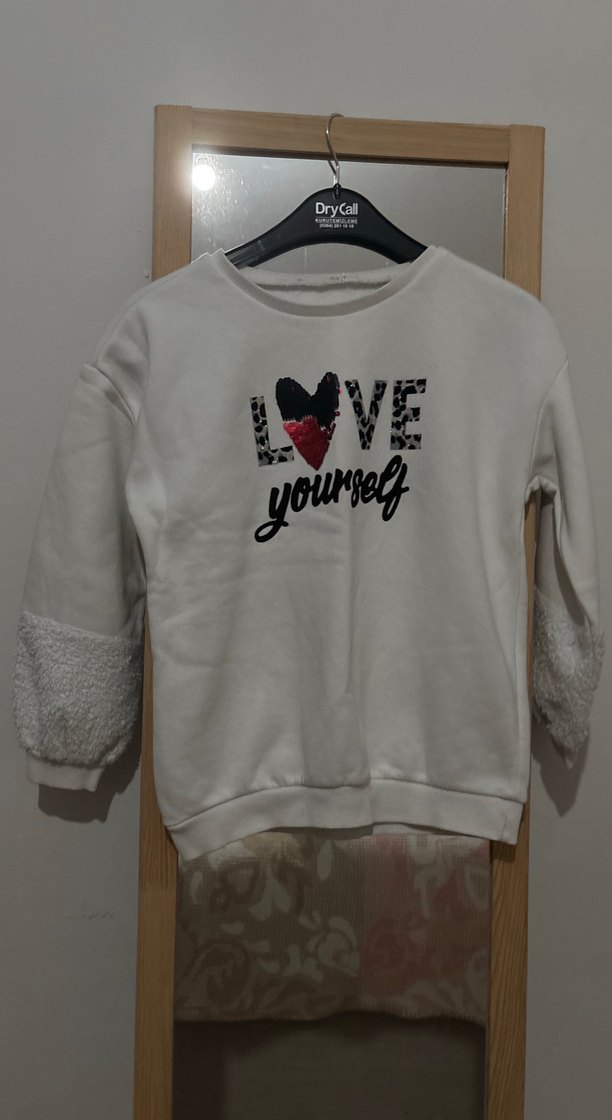 Beyaz pamuk kız sweatshirt, uzun kollu ve yuvarlak yaka. Bol kesim, baskılı "LOVE yourself" yazılı ve örme detaylı kollara sahip. Trendy rahat stil için uygun.