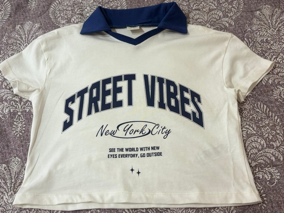 Yumuşak pamuklu, beyaz, V yakalı, kısa kollu, bol kesim kız tişörtü. "STREET VIBES New York City" baskılı ve motive edici yazılar içerir.
