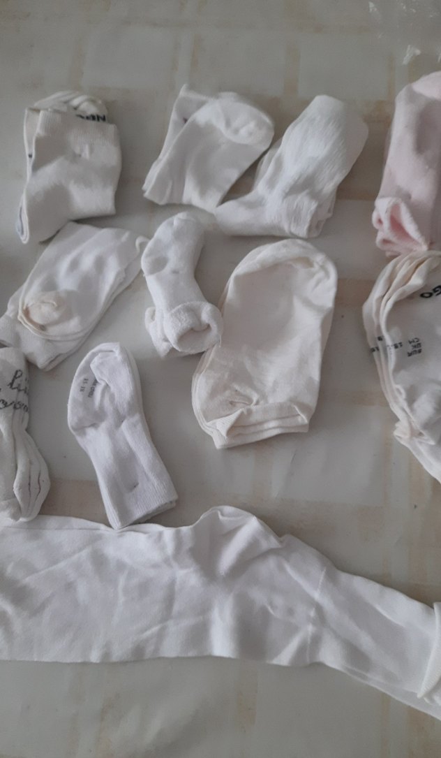 Yumuşak pamuklu, desensiz beyaz kız ve bebek çorabı, günlük kullanım için rahat. hafif lekeli beyaz olduğu için lekeleri çıkabilecek durumda defolu olduğu için 4 çifti 20 tl dir.