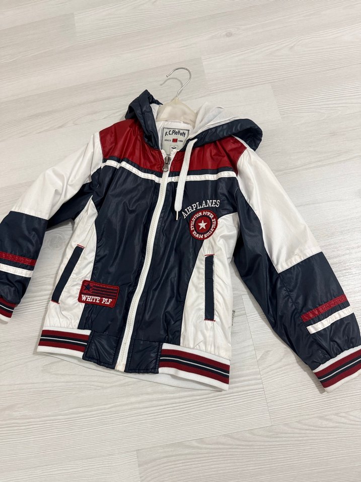 Fermuarlı ve kesimli, erkek çocuk montu. Koyu mavi, beyaz ve kırmızı renklerle baskılı detaylar ve yumuşak kürk astar içerir. Sokak stili için uygun.