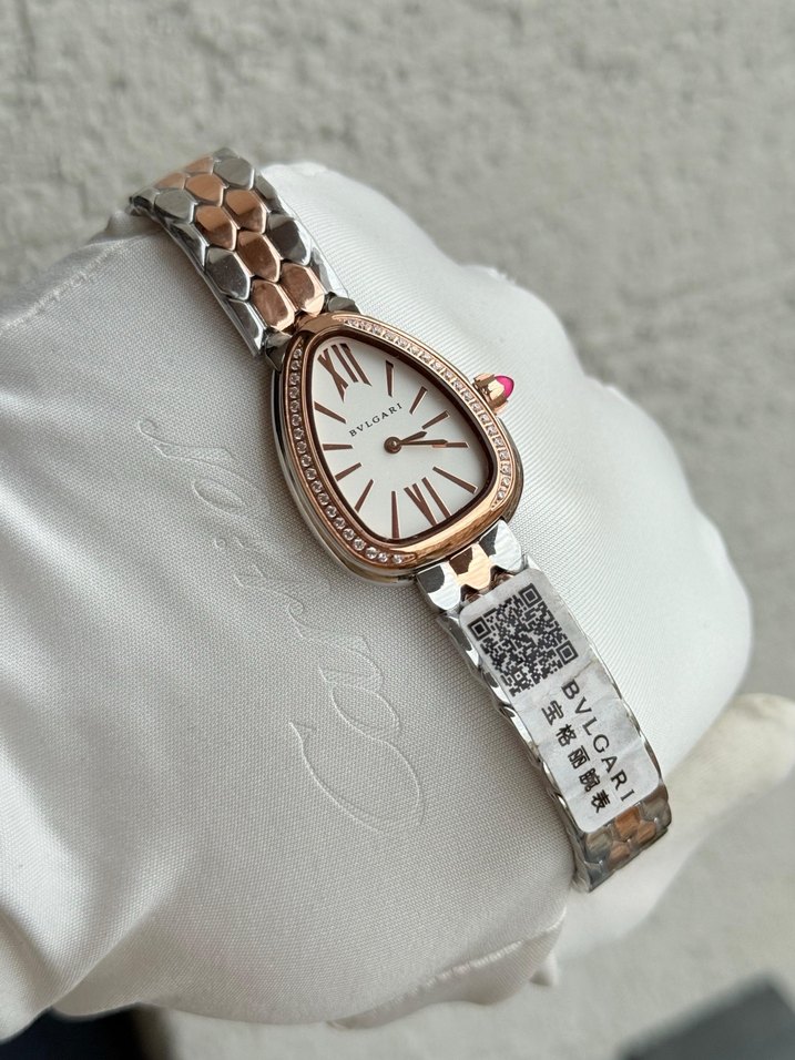 Bvlgari kadın kol saati, beyaz kadran ve Roma rakamlarıyla klasik şıklık sunar. Gümüş ve rose altın tonlarında renkli, tokalı metal bileziği vardır. ⌚