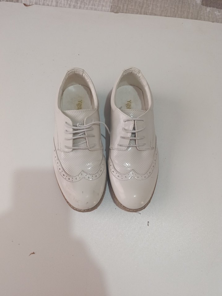 Beyaz renkte, klasik ve sade tasarıma sahip, kauçuk tabanlı, pastel tonlarda erkek çocuk özel ayakkabısı.