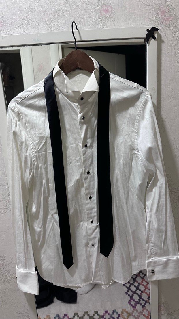 Düğmeli beyaz erkek gömlek, Ata yaka ve pamuk kumaştan yapılmıştır. normal kesim ve goth stilinde, kol düğmeli modeldir ve siyah kravat