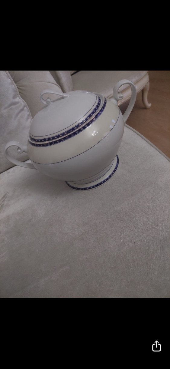 Beyaz klasik kapaklı servis çömleği, kenarlarında ince gri-mavi bant detayları ve iki kulpla birlikte yuvarlak geleneksel şekildedir. ️