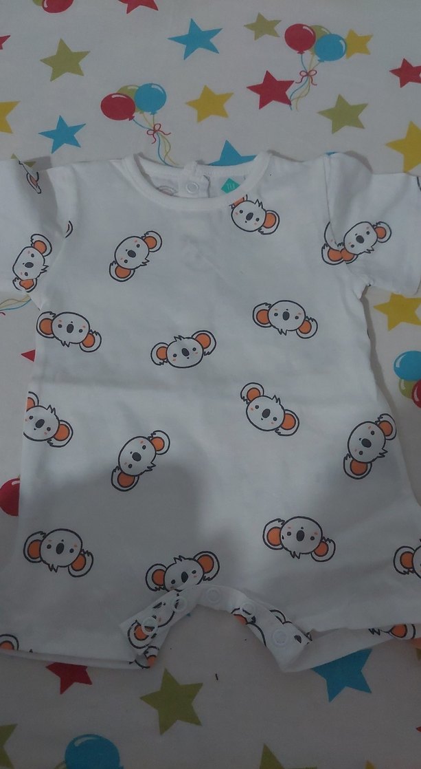 Yumuşak pamuklu beyaz bebek tulumu, kısa kollu ve renkli koala desenlidir. Kolay giydirme için düğmeli ve yuvarlak yakalıdır.