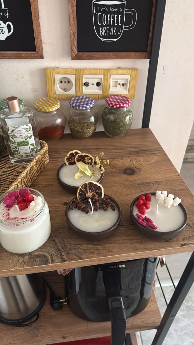 Kurutulmuş meyve ve çiçeklerle süslenmiş beyaz kokulu mumlar, ahşap yüzeyde yer alıyor. ️adet fiyatı değişiyor
