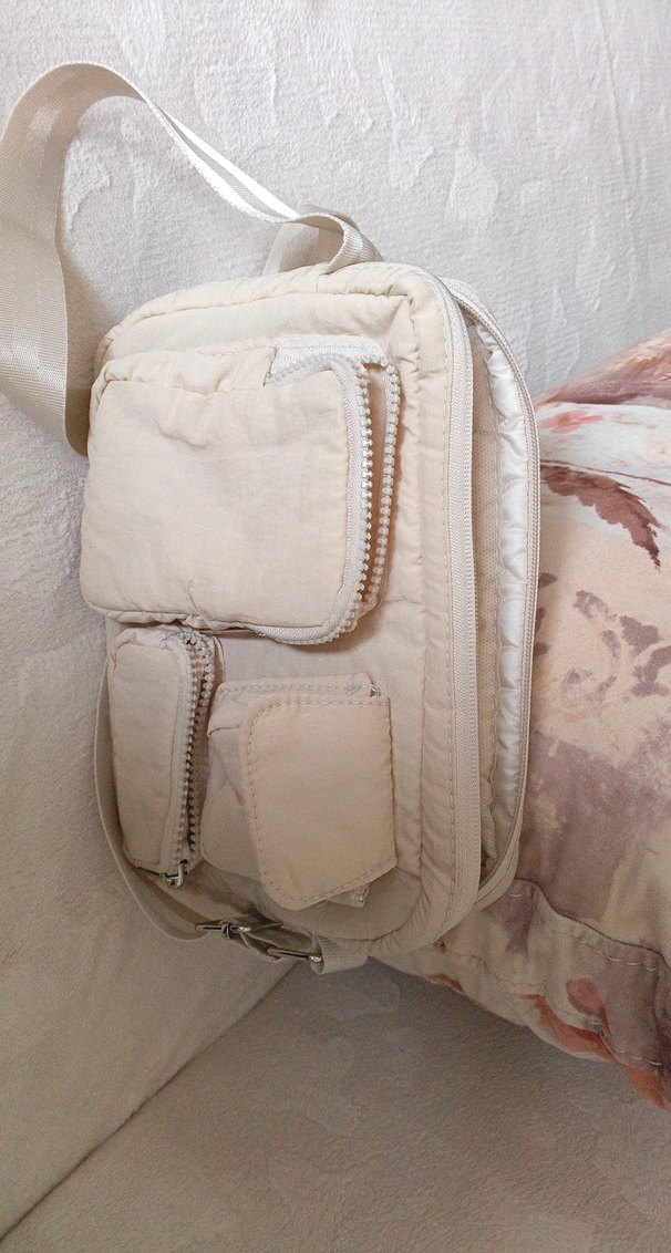 Beyaz, yumuşak pastel tonlarında, çoklu fermuarlı cepleri olan bebek çantası. Ayarlanabilir askıları bulunur.