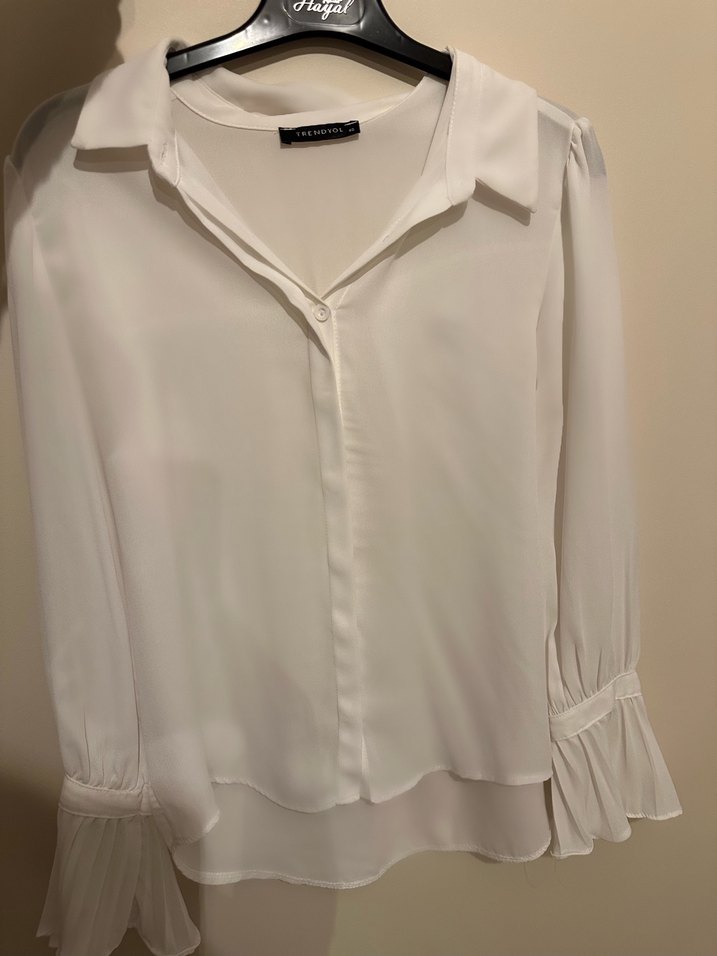 Beyaz uzun kollu kadın gömleği. İpeksi kumaştan, bol kesim ve normal midi boyda. Kolları hafif pilelidir. Ofis ve günlük sokak stili için uygun. Az giyildi deformasyon yok. Trendyol 40 beden. M-L bedenler için uygundur.