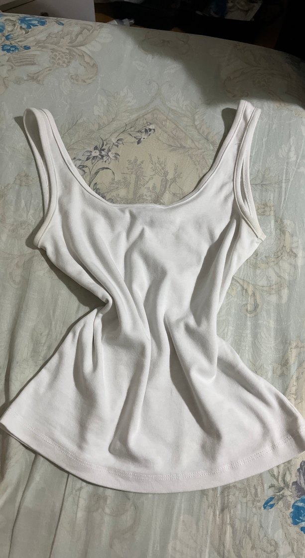 Yumuşak keten kumaştan, kolsuz ve askısız yakalı, normal midi uzunlukta, sade ve şık beyaz kadın atlet.