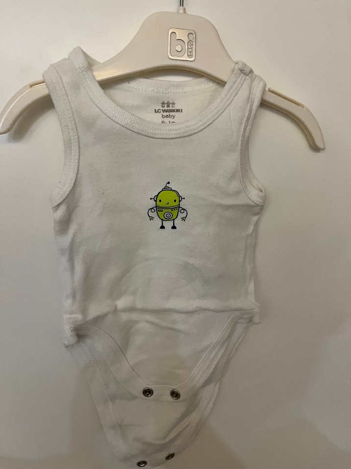 Beyaz kolsuz bebek body, yuvarlak yaka ve pamuklu yumuşak kumaş. Önünde küçük yeşil robot baskısı ile rahat ve sade sokak stili sunar.