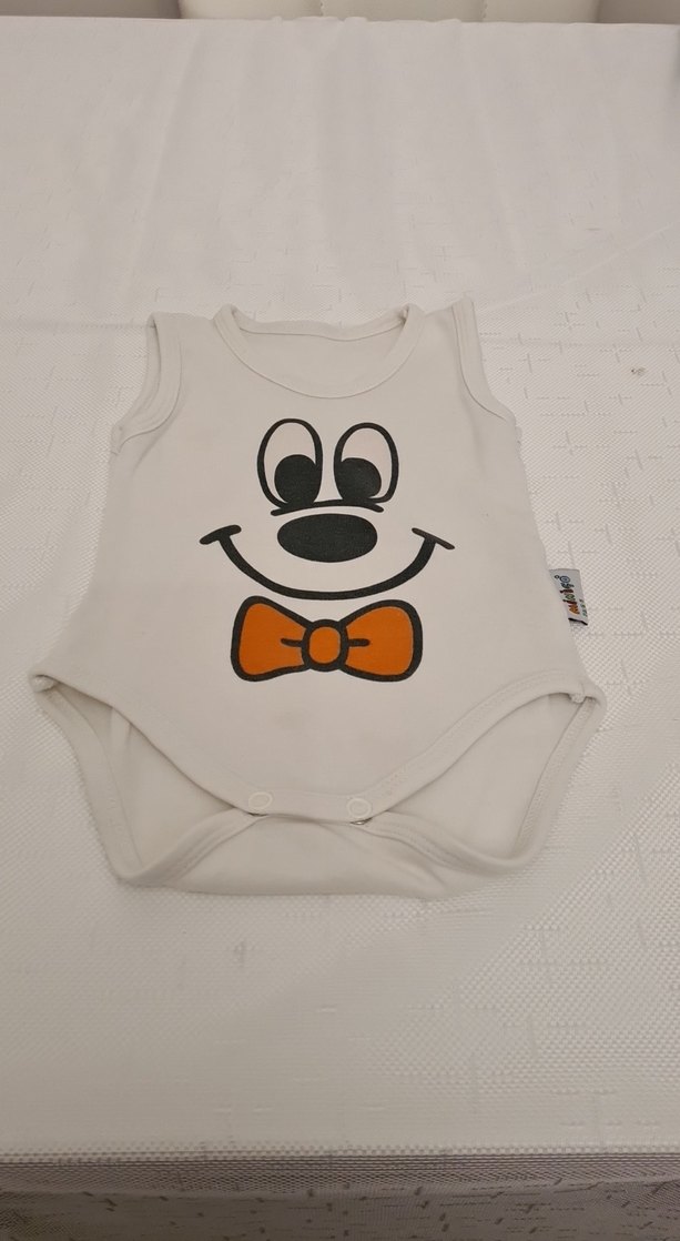 Kolsuz beyaz bebek body, önünde renkli baskılı yüz ve turuncu fiyonk detayı bulunur. Yuvarlak yakalı ve yumuşak kumaştan üretilmiştir. 6yada 9 aylık yazıyor. Fakat 3 aylık için iyi
