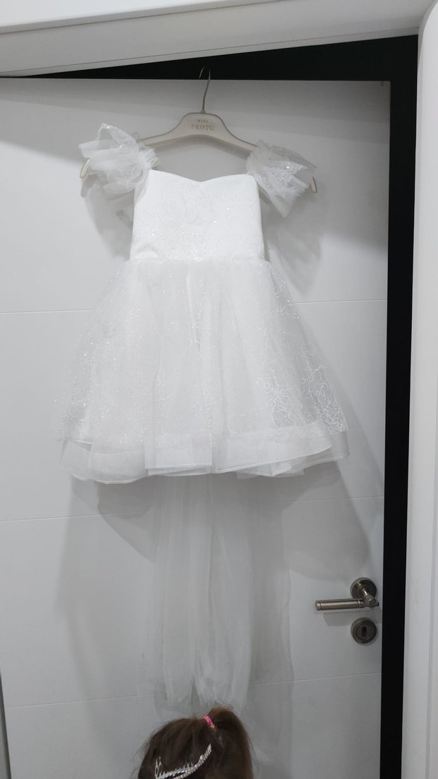 Beyaz kolsuz kız elbisesi, tekne yaka ve fırfır detaylıdır. Yumuşak sentetik kumaştan kat kat eteklere sahip, çağdaş ve desensiz bir tasarımdır.