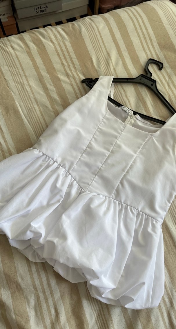Beyaz kolsuz, fırfırlı, straplez mini bluz. Hafif keten kumaştan, rahat ve bol kesim. Günlük sokak stiline uygun.