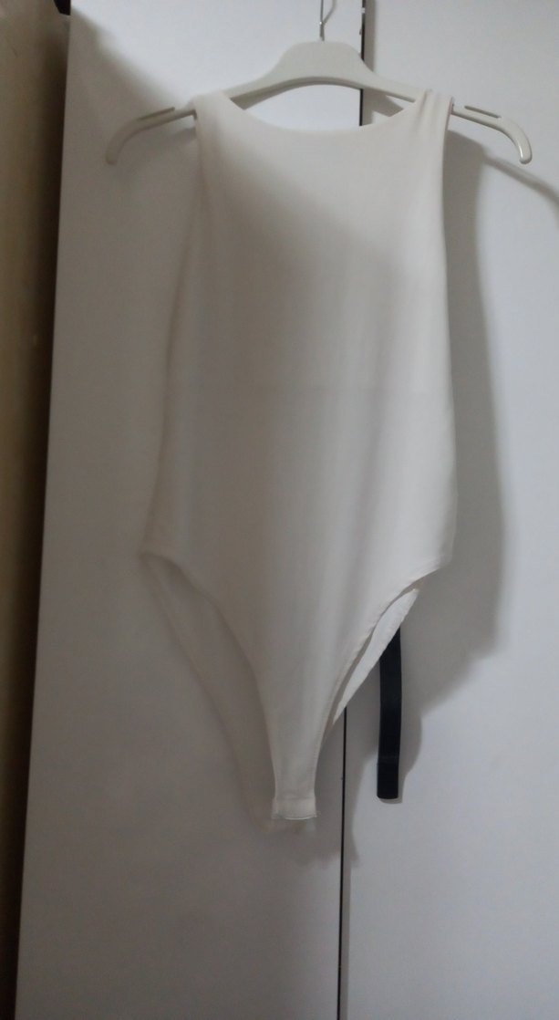 Beyaz, kolsuz ve vücuda oturan midi uzunlukta monokini. Minimalist ve çağdaş tasarıma sahip, günlük kullanım için uygun.