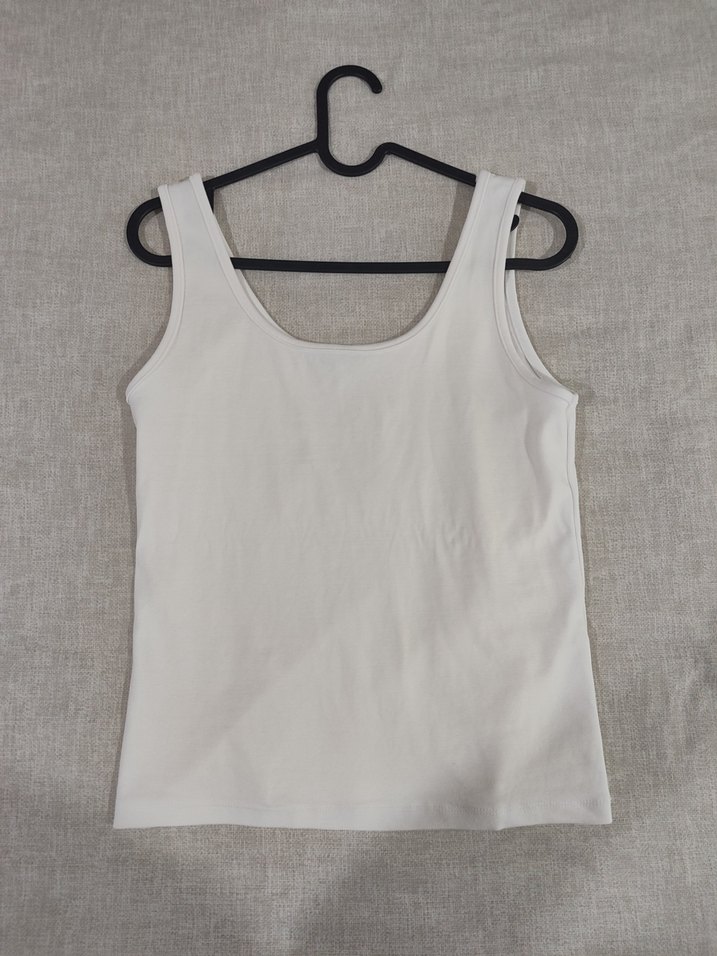 Beyaz, kolsuz, yuvarlak yakalı ve vücuda oturan kesimde, rahat ve hafif keten kumaştan yapılmış kadın atleti. Minimalist, günlük sokak tarzına uygundur.