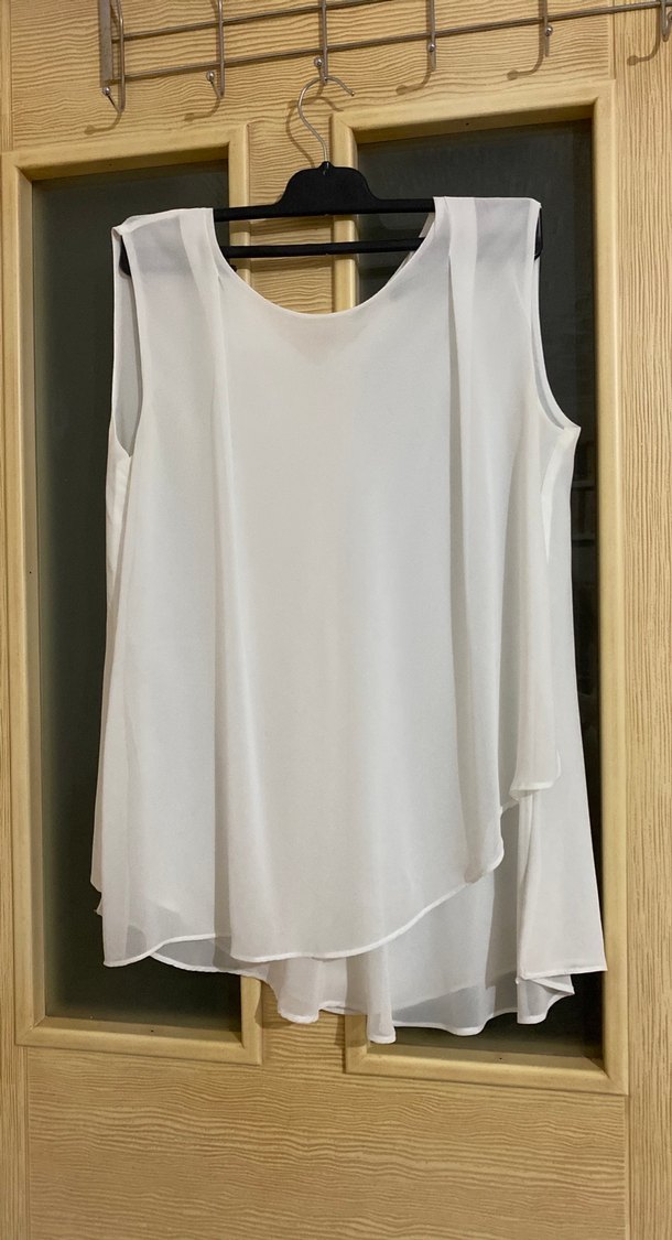 Beyaz kolsuz bluz, drapeli tasarımı ve askısız yakasıyla dikkat çeker. İpek gibi kumaştan, bol kesim ve midi boyda, minimalist stile uygundur. Göğüs 46cm , boy 63cm , hiç kullanılmadı