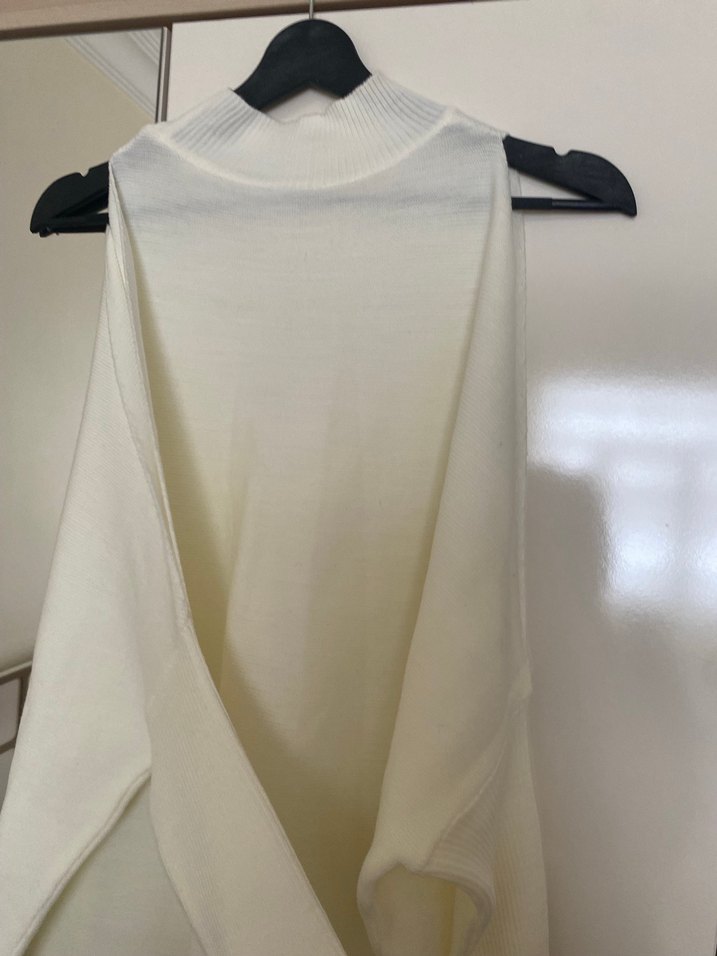 Beyaz renkte, yüksek yakalı ve kolsuz bu kadın kazak, dökümlü tasarıma sahiptir. Vücuda oturan, midi boyda, yumuşak sentetik kumaştandır. Günlük kullanıma uygundur. Kollarında büyük pencere detayları var hiç kullanılmadı standart beden oversize xl bedene kadar olur en 74 cm boy 66 cm