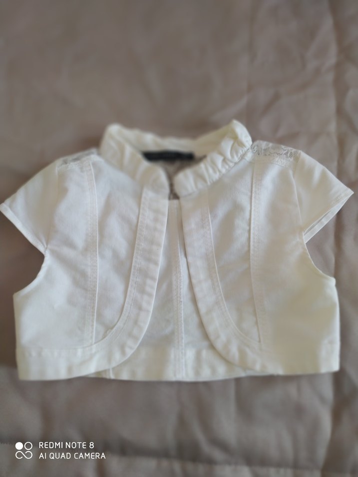 Kız çocukları için beyaz, kolsuz, keten kumaştan yapılmış, yakalı ve düğmesiz sade ve desen içermeyen, dar kesim bolero.