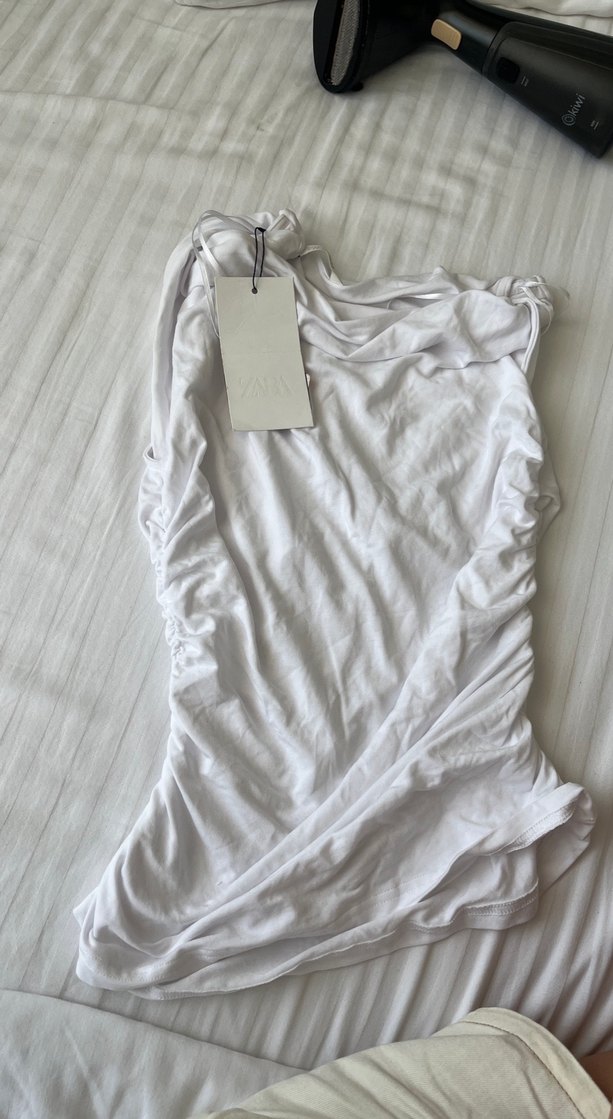 Keten kumaştan, beyaz kolsuz bluz. Dökümlü tasarımı ve tekne yaka detayıyla, baskılı ve vücuda oturan kesimde, günlük sokak stiline uygun minimal bir parça.