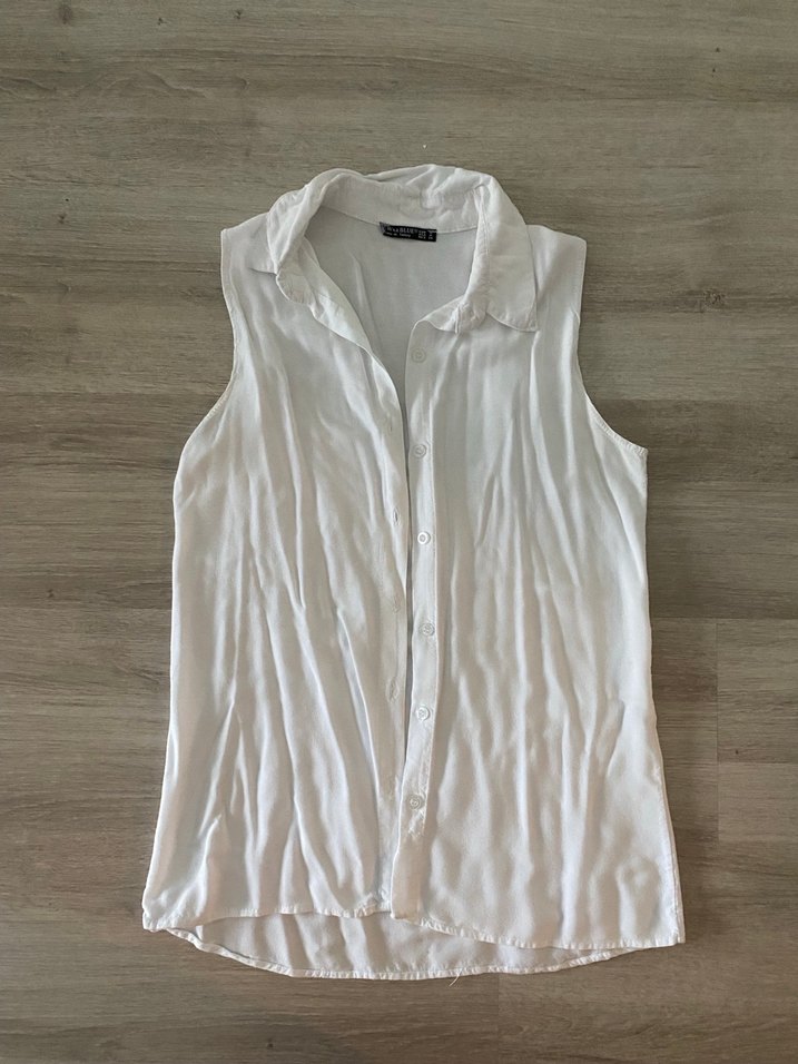 Kolsuz, beyaz keten gömlek, yakalı ve düğmeli. Bol kesim ve normal boyda, günlük sokak stili için uygun.
