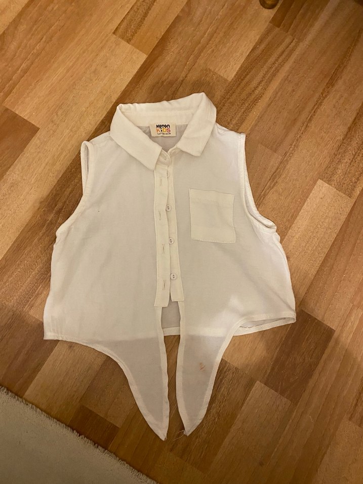 Keten kumaştan, kolsuz ve düğmeli, yakalı, bol kesim midi uzunlukta beyaz çocuk gömleği. Günlük kullanıma uygun, özgün asimetrik etek ucu detaylı.
