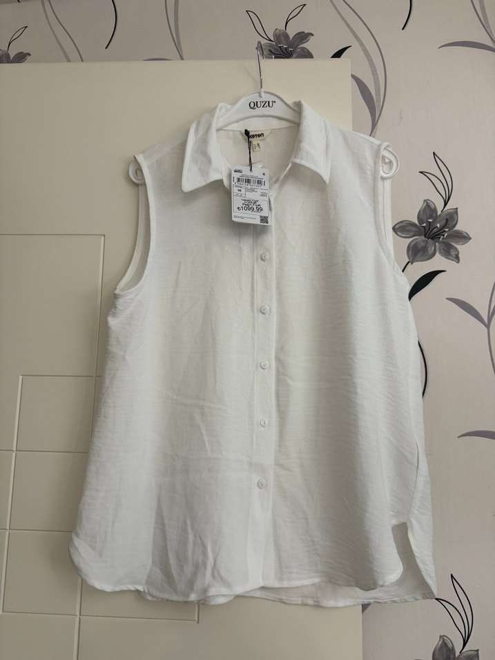 Beyaz kolsuz keten gömlek, yakalı ve düğmeli ön detaylıdır. Hafif keten kumaştan, bol kesim ve midi boydadır, günlük sokak stiline uygundur.
